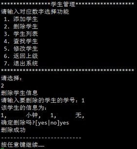 #2.删除学生 del_student() { read -p "请输入要删除的学生的学号:" num echo "该学生的信息为:" grep "^$num" $students_db read -p "确定删除吗?[yes|no]" choice case "$choice" in yes) sed -i -e "/^$num/d" $students_db if [ "$?" -eq 0 ]; then echo "删除成功" else echo "不存在该条记录或者删除失败" fi ;; no) : ;; *) echo "请输入[yes|no]" del_student ;; esac } |
