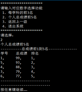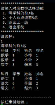 查询数据模块中比较有特色的是成绩统计功能,这里主要研究的是统计各科目的前三名和个人总成绩前五,这里使用awk命令加管道,再利用sed命令取出前几条数据将其输出。