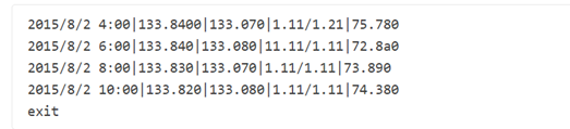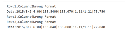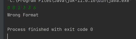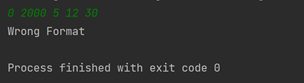 样例3: 题目集4的代码区域: No1: import java.util.ArrayList; import java.util.Collection; import java.util.Iterator; import java.util.Scanner; import java.util.regex.Matcher; import java.util.regex.Pattern; public class Main { public static void main(String[] args) { int f1 = 0;int f2 = 0;int f3 = 0;int f4 = 0;int f5 = 0;int f6 = 0; Double totalWaterFlow = 0.0; Double muBiao = 0.0; Double shiJi = 0.0; int sumOut = 0; int hasWrong = 0;int oneHasWrong = 0; String str = "2015/8/2 6:00|133.840|133.080|11.11/1.11|72.8a0"; Scanner input = new Scanner(System.in); Double maxShuWei = 0.0; ArrayList c = new ArrayList();/* 创建集合数组对象 */ String news = input.nextLine(); while (!(news.equals("exit"))) { c.add(news);news = input.nextLine(); } //c.add("exit"); Iterator t =c.iterator(); for(int ii =0; ii < (c.size()); ii++){ oneHasWrong = 0;sumOut=0; Object obj = t.next(); if(obj instanceof String){str = ((String)obj).trim();} if(str.matches("^\\s*|\\s*$")) { //判断连续输入为空 System.out.println("Max Actual Water Level:0.00"); //判断连续输入为空 System.out.println("Total Water Flow:0.00"); } String[] pattern = {"([0-9]+)(\\/)([0-9]+)(\\/)([0-9]+)(\\s)([0-9]+)(:)([0-9]+)", "(\\|)((\\s*)?)([0-9]+)(\\.?)([0-9]+)", "(\\|)([0-9]+)(\\.?)([0-9]+)(\\/)([A-Za-z0-9]+)(\\.?)([0-9]+)"}; Pattern r = null; String[] s = new String[5]; int j = 0; String temp = str; for (int i = 0; i < 5; i++) { if(i == 0) { r = Pattern.compile(pattern[0]); }else if (i == 3) { r = Pattern.compile(pattern[2]); }else { r = Pattern.compile(pattern[1]); } Matcher m = r.matcher(temp); if(m.find()) { s[j] = m.group(); temp = temp.substring(s[j].length());j++;} } //if(j != 5){System.out.println("Wrong Format"); System.out.println("Data:" +str); System.exit(0);} int[] monthDay = {0,31, 28, 31, 30, 31, 30, 31, 31, 30, 31, 30, 31}; for (int i = 0; i < j; i++) { if(i == 0){ s[i] = s[i].trim(); String regular = "((([1-9][0-9]{0,3}))/((((1[0-2]|[1-9]))/(([1-2][0-9]|30|[1-9])))) ((([02468]|1[02468]|2[02]|):00)))"; if(!s[i].matches(regular)) { System.out.println("Row:"+(ii+1)+",Column:1Wrong Format");f1 = 1; } } if(i == 1){ /* 还用正则表达式来求 |133.8400 */ s[i] = s[i].substring(1); s[i] = s[i].replaceAll(" ",""); String regular = "[1-9]([0-9]?)([0-9]?)(\\.)?[0-9]([0-9]?)([0-9]?)"; if(!s[i].matches(regular)) { System.out.println("Row:"+(ii+1)+",Column:2Wrong Format");f2 = 1; } } if(i == 2){ // |133.070 s[i] = s[i].substring(1); s[i] = s[i].replaceAll(" ",""); String regular = "[1-9]([0-9]?)([0-9]?)(\\.)?[0-9]([0-9]?)([0-9]?)"; if(!s[i].matches(regular))// 不满足就是输出错误 { System.out.println("Row:"+(ii+1)+",Column:3Wrong Format");f3 = 1; } if(f3 == 0 && Double.parseDouble(s[i]) > maxShuWei){ maxShuWei = Double.parseDouble(s[i]); } } if(i == 3){ // |1.11/1.21 s[i] = s[i].substring(1); s[i] = s[i].replaceAll(" ",""); String[] mbf = s[i].split("/");// mbf 每部分 其实就两部分,目标开度、实际开度 for (int k = 0; k < mbf.length; k++) { if(k == 0){// 目标开度 --> |1.11 String regular = "[1-9](\\.)?[0-9]?([0-9]?)"; if(!mbf[k].matches(regular))// 不满足就是输出错误 { System.out.println("Row:"+(ii+1)+",Column:4Wrong Format");f4 = 1; } else { muBiao = Double.parseDouble(mbf[k]);} } if(k == 1) {// 实际开度 --> 1.21 String regular = "[1-9](\\.)?[0-9]?([0-9]?)"; if(!mbf[k].matches(regular))// 不满足就是输出错误 { System.out.println("Row:"+(ii+1)+",Column:5Wrong Format");f5 = 1; } else { shiJi = Double.parseDouble(mbf[k]); } } } if(shiJi > muBiao) sumOut++; } if(i == 4){ // |75.780 s[i] = s[i].substring(1); s[i] = s[i].replaceAll(" ",""); String regular = "[1-9]([0-9]?)([0-9]?)(\\.)?[0-9]([0-9]?)([0-9]?)"; if(!s[i].matches(regular)) { System.out.println("Row:"+(ii+1)+",Column:6Wrong Format");f6 = 1; } if(f6 == 0){/* 求出流量,再加到总流量里去 */ Double flow = Double.parseDouble(s[4]); totalWaterFlow = totalWaterFlow + 2*60*60*flow; } } } if(f1==0 && f2==0 && f3==0 && f5 == 0 && f4 ==0 && f6==0 && shiJi > muBiao)// 就说明开度出现了问题就提示错误 { for (int i = 0; i < sumOut; i++) { System.out.println("Row:"+(ii+1)+" GateOpening Warning"); } } if(f1==1 || f2==1 || f3==1 || f4==1 || f5==1 || f6==1){ hasWrong++; oneHasWrong++; } if(oneHasWrong != 0) System.out.println("Data:"+str); f1 = 0;f2=0;f3 = 0;f4=0;f5=0;f6=0; oneHasWrong = 0; } if(hasWrong == 0){ System.out.println("Max Actual Water Level:" +String.format("%.2f",+maxShuWei));/* 输出最大的水位信息 */ System.out.println("Total Water Flow:" +String.format("%.2f",+totalWaterFlow));} } public static boolean isLeapYear(int year){ return (year % 4 == 0 && year % 100 != 0) || year % 400 == 0; } } No2: