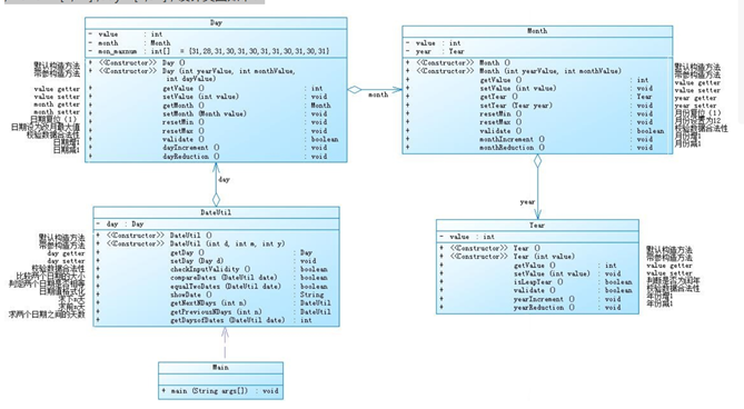 参考题目7-3的要求,设计如下几个类:DateUtil、Year、Month、Day,其中年、月、日的取值范围依然为:year∈[1820,2020] ,month∈[1,12] ,day∈[1,31] , 设计类图如下: