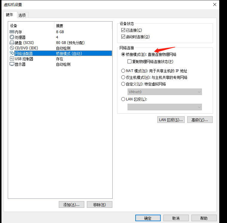 将模式修改为桥接: 网卡和主机一致