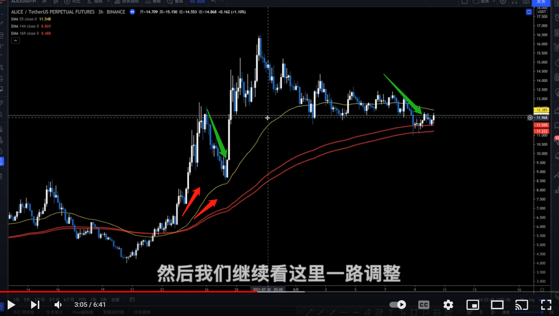 2. 第二步就是找到几分钟的级别,这里你就看第一个绿色箭头,这第一次回调,是踩了几分钟的ema55。这里是3小时的图ema55趋势