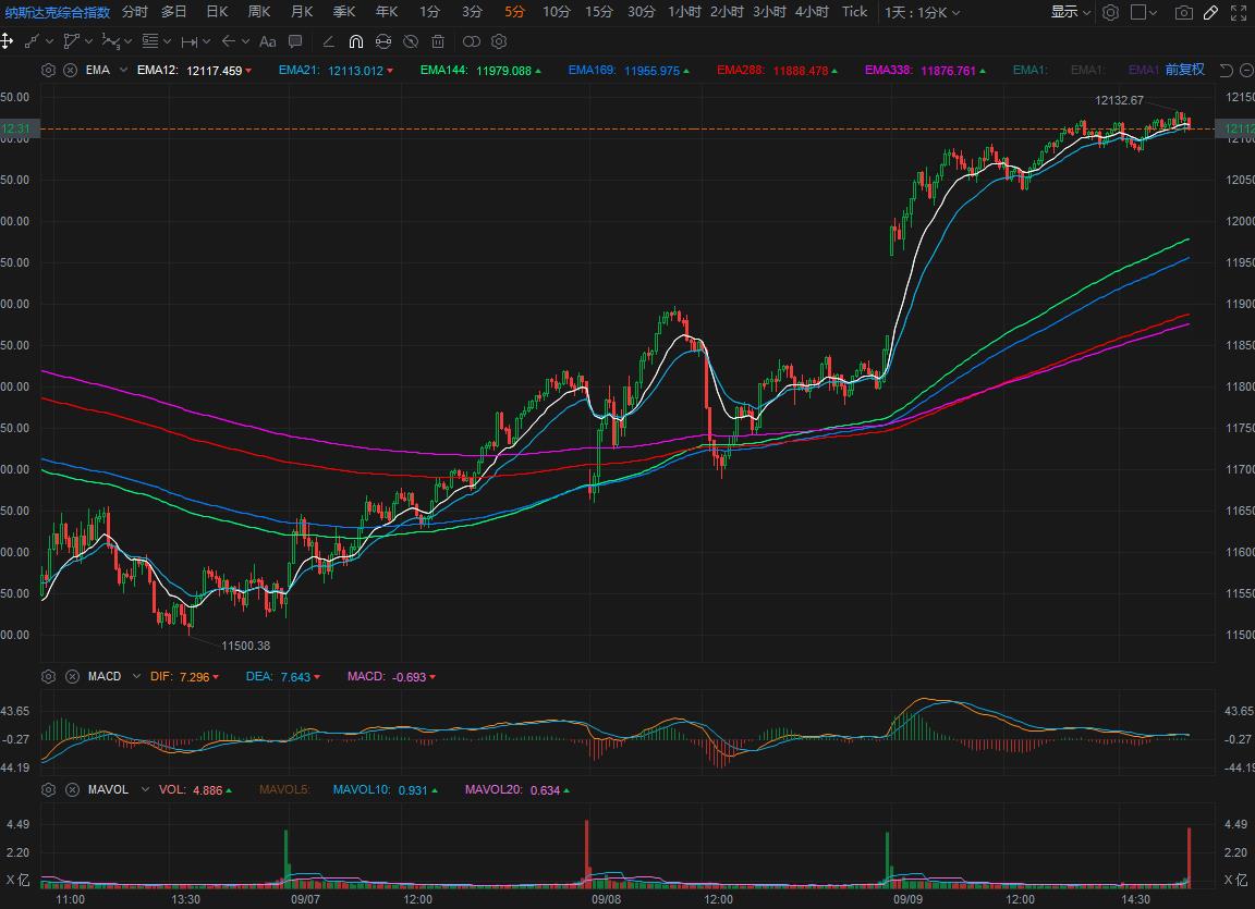 纳斯达克1分钟图,注意,注意,大级别上升趋势过程中,只要趋势线没有被突破之前,不要考虑做空