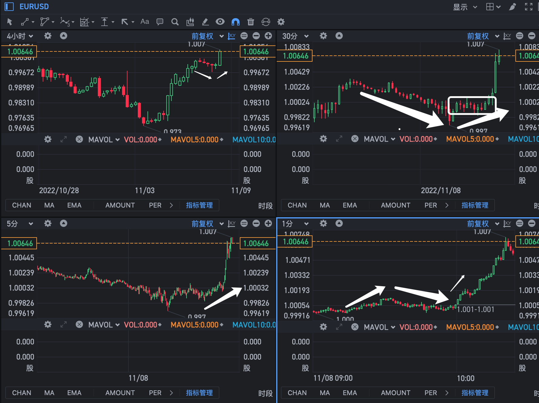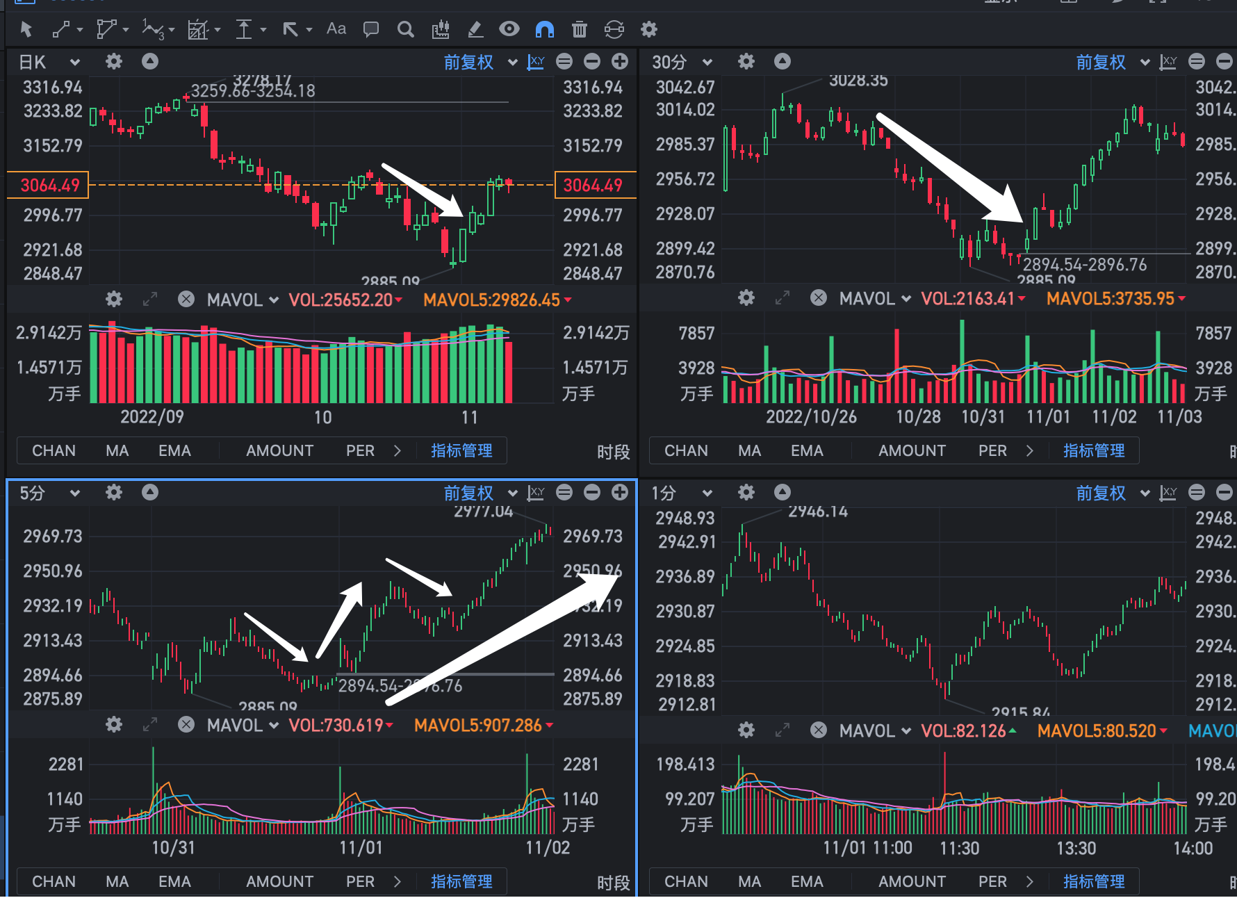 2022-11-08 行情启动时的拐点,上下上形成了奔走中枢或者线段走势