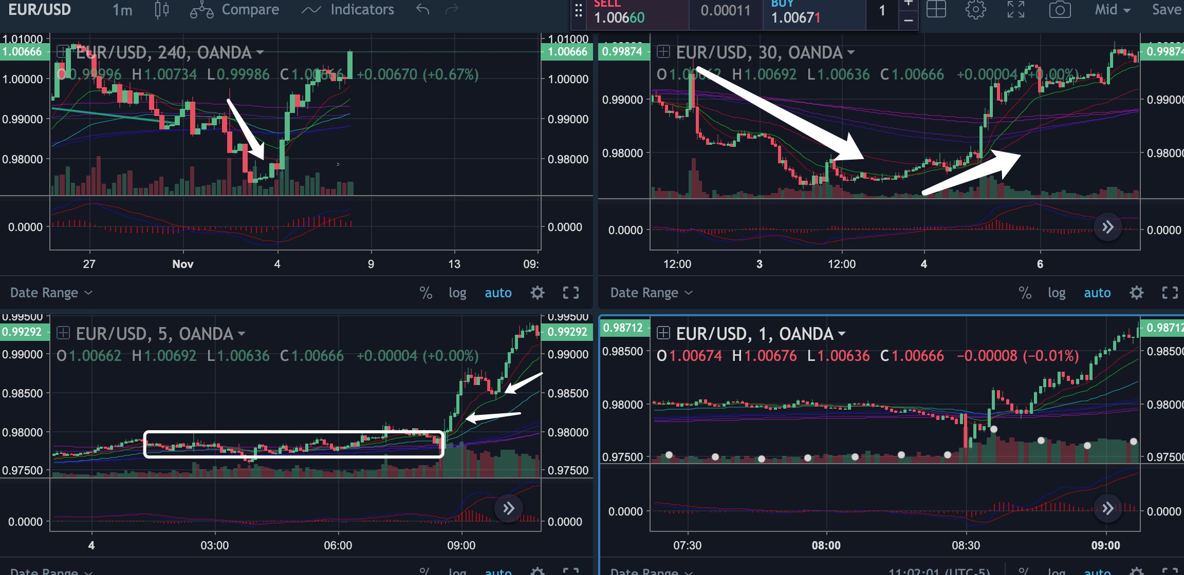 1分钟的一段下上下走势引出的5分钟一笔上涨