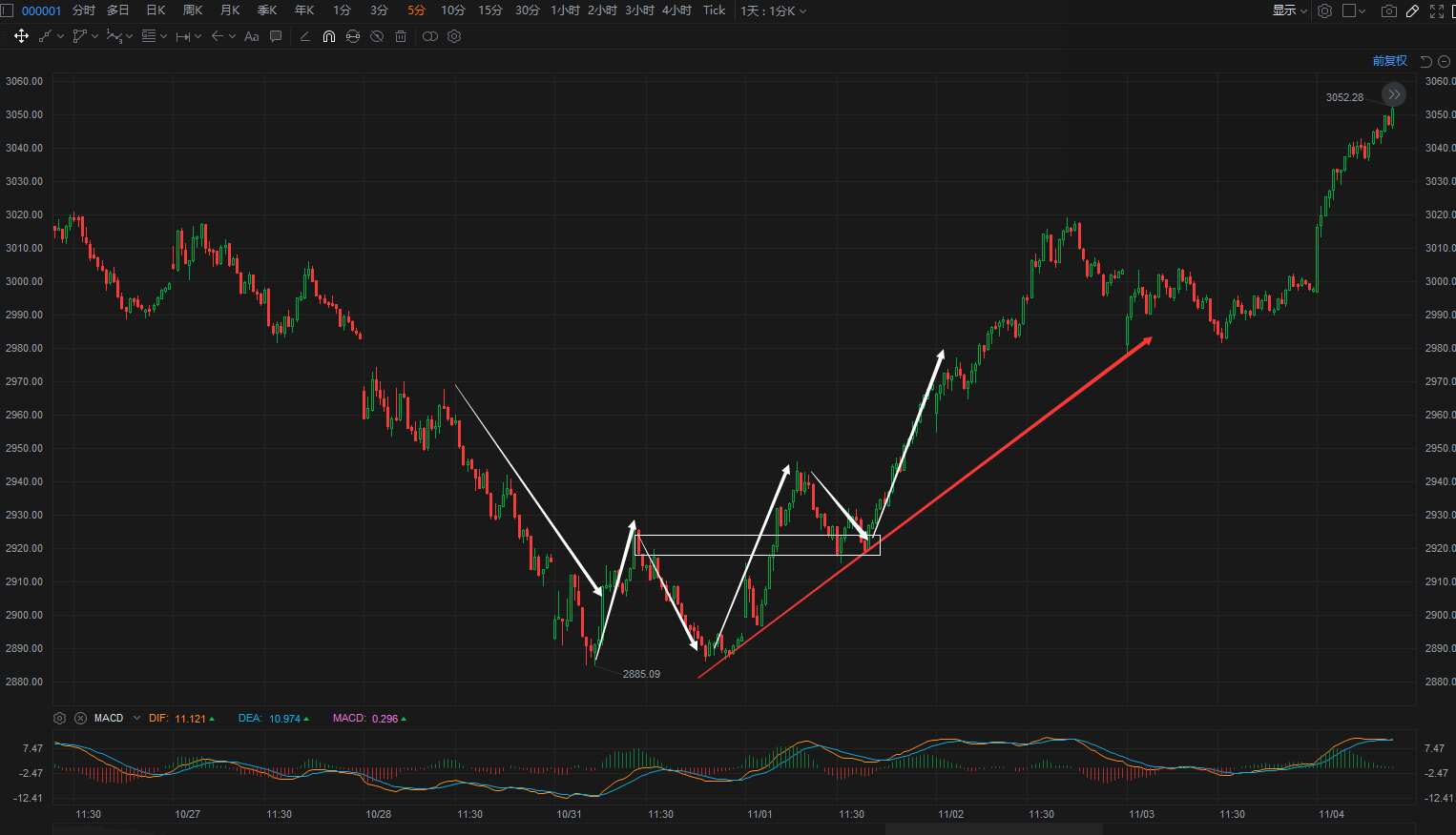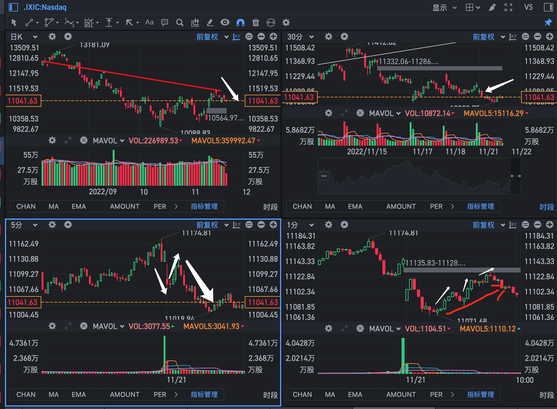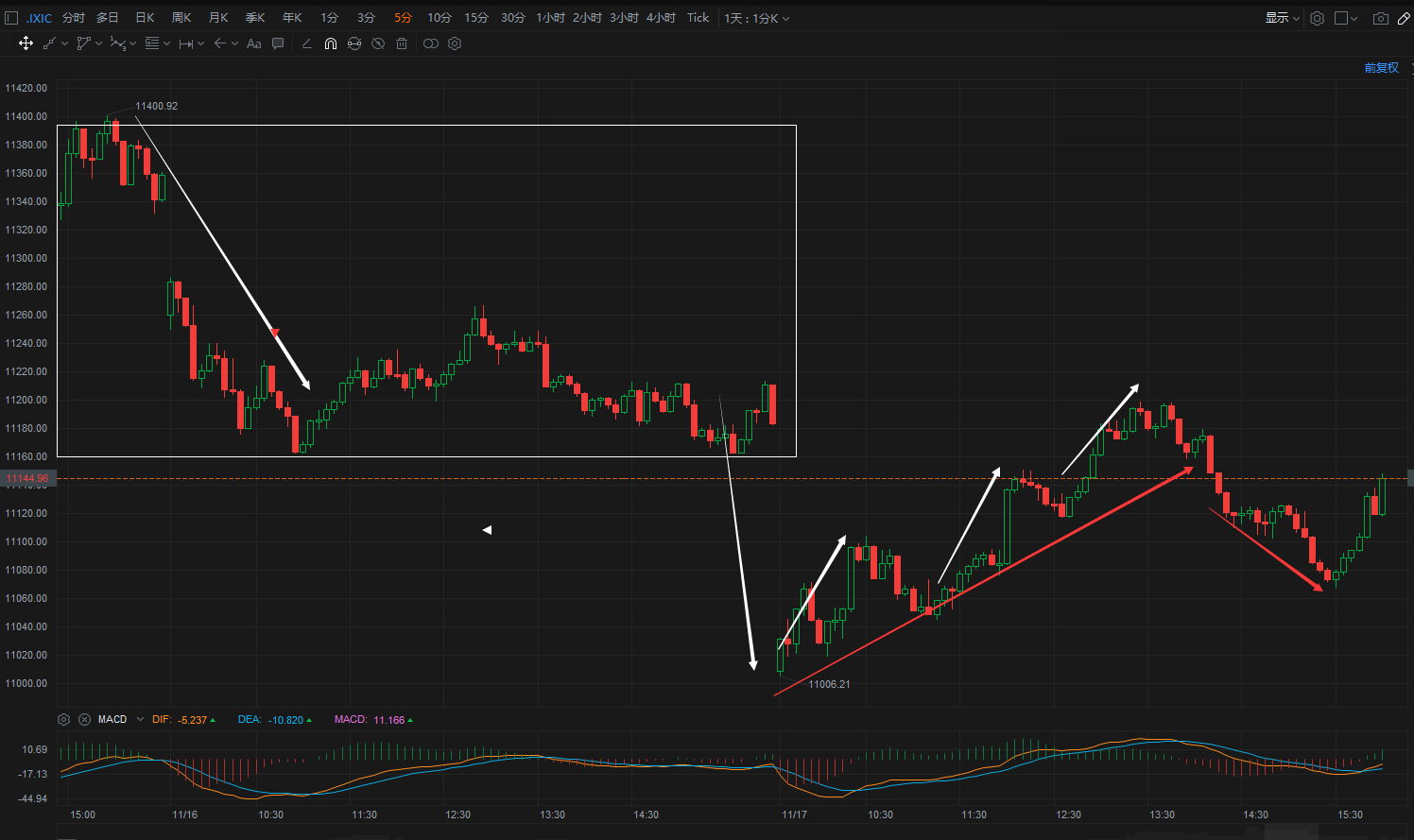 例4:2022年11月18日。纳斯达克指数1分钟图。是b段的下跌,3段反弹之后形成背驰。然后形成第二个中枢。之后震荡上行。