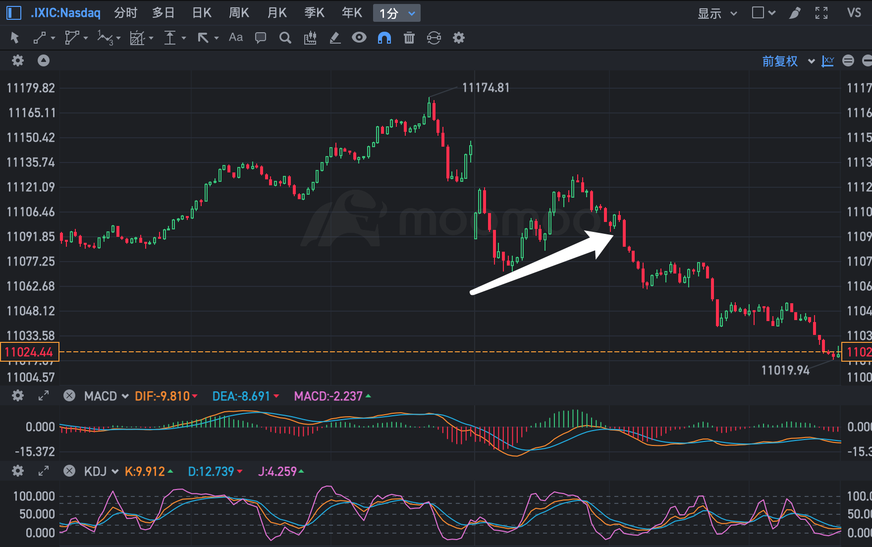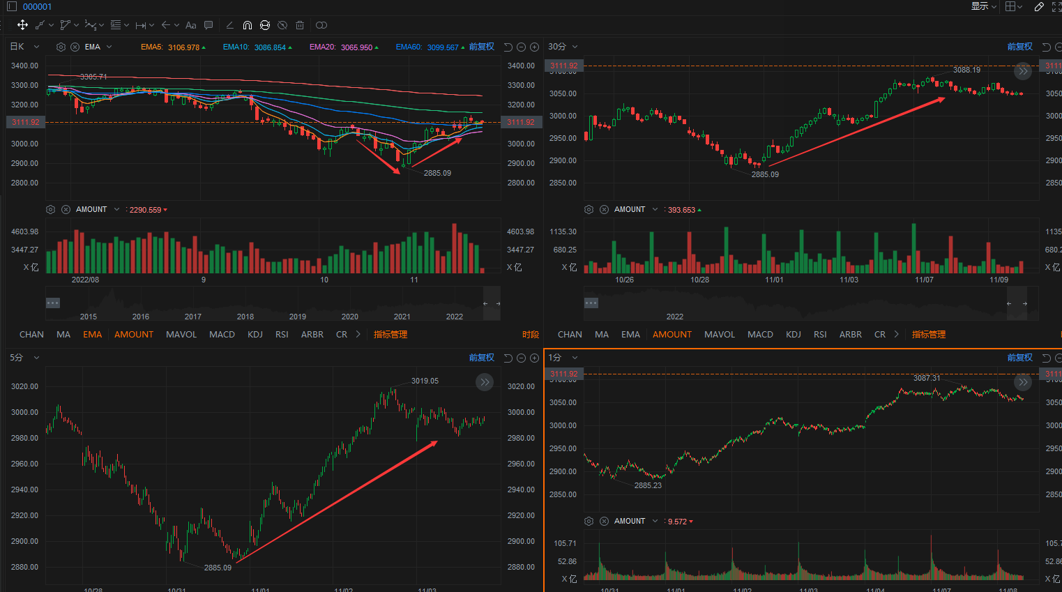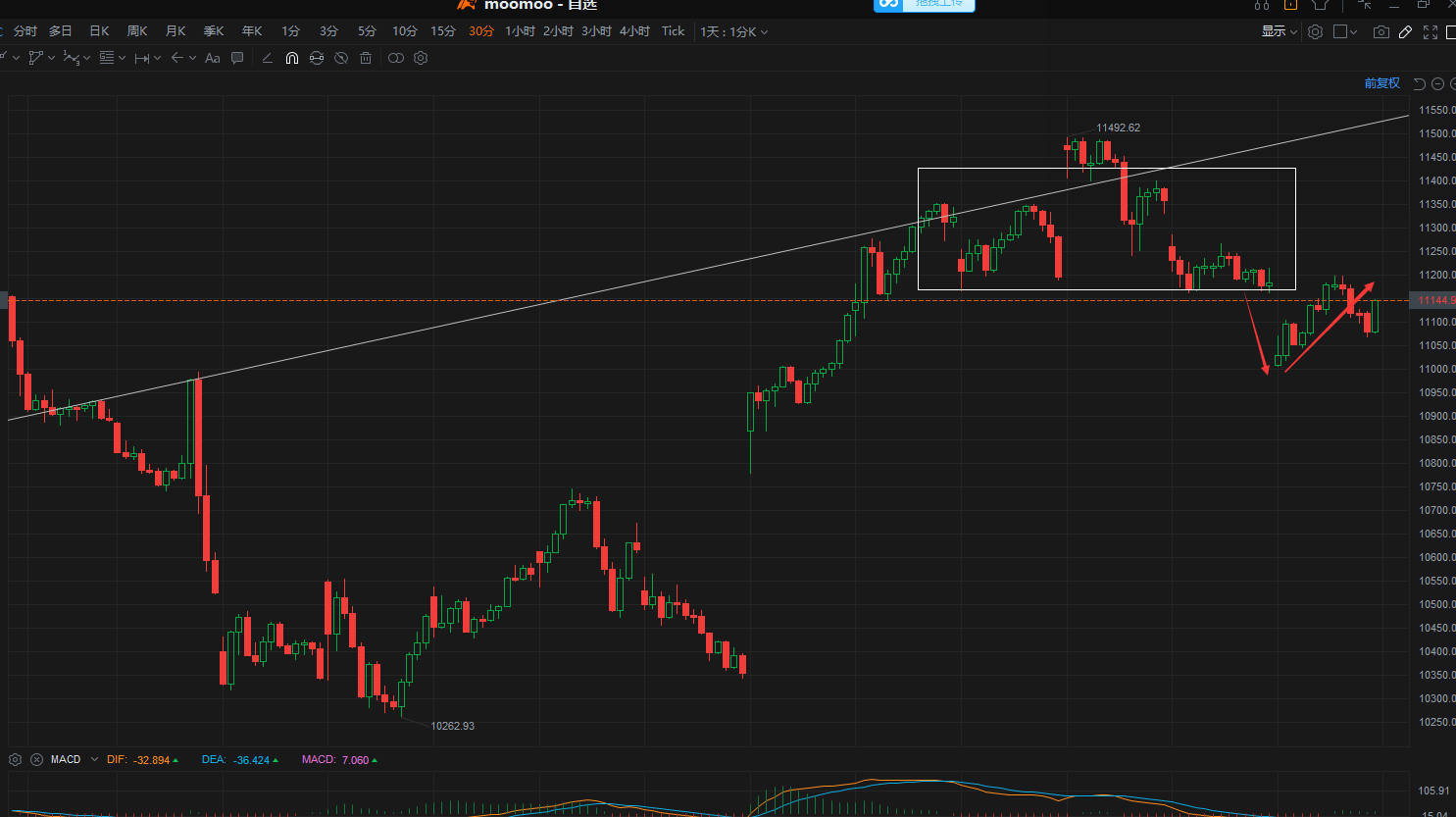 例4:2022年11月18日。纳斯达克指数1分钟图。是b段的下跌,3段反弹之后形成背驰。然后形成第二个中枢。之后震荡上行。