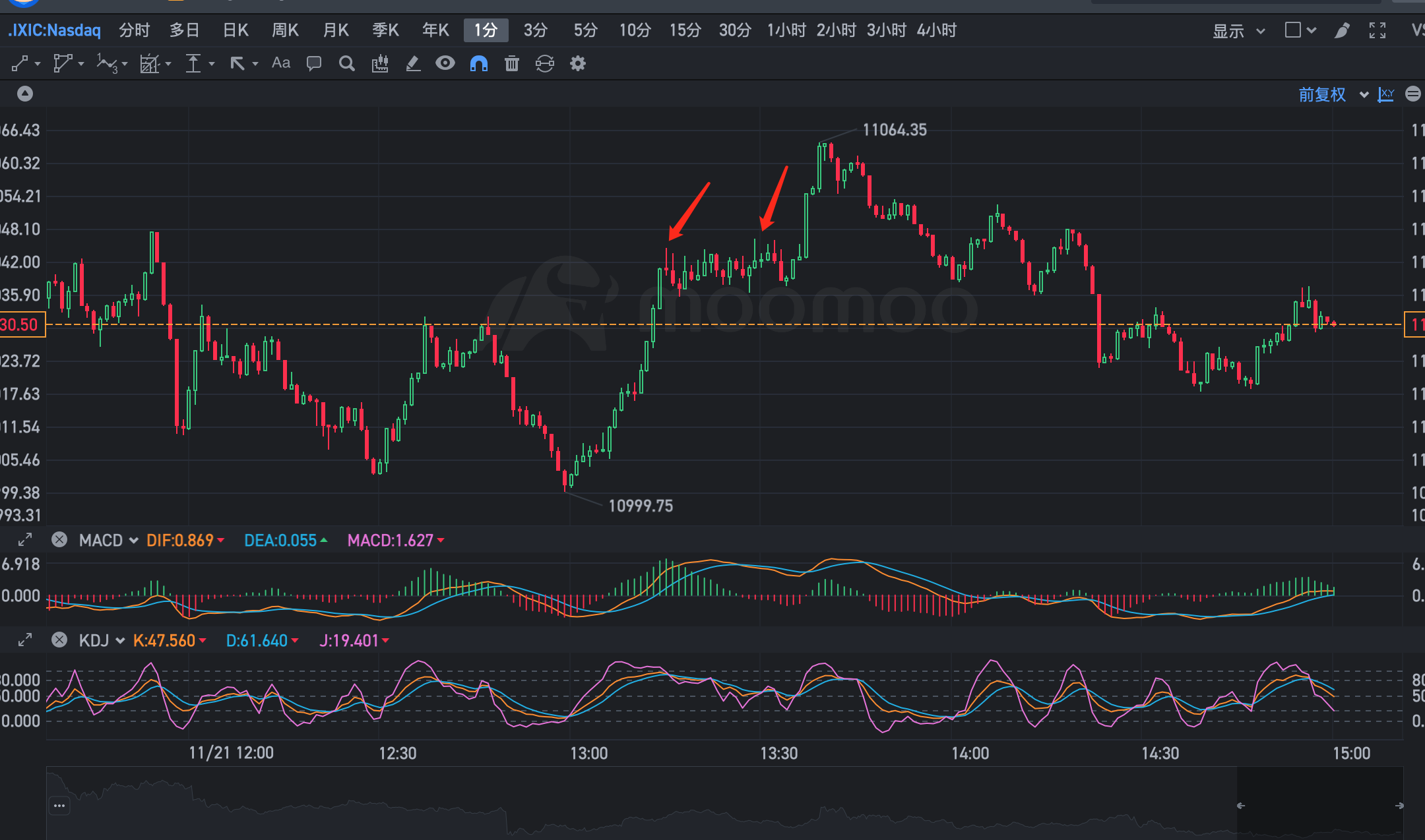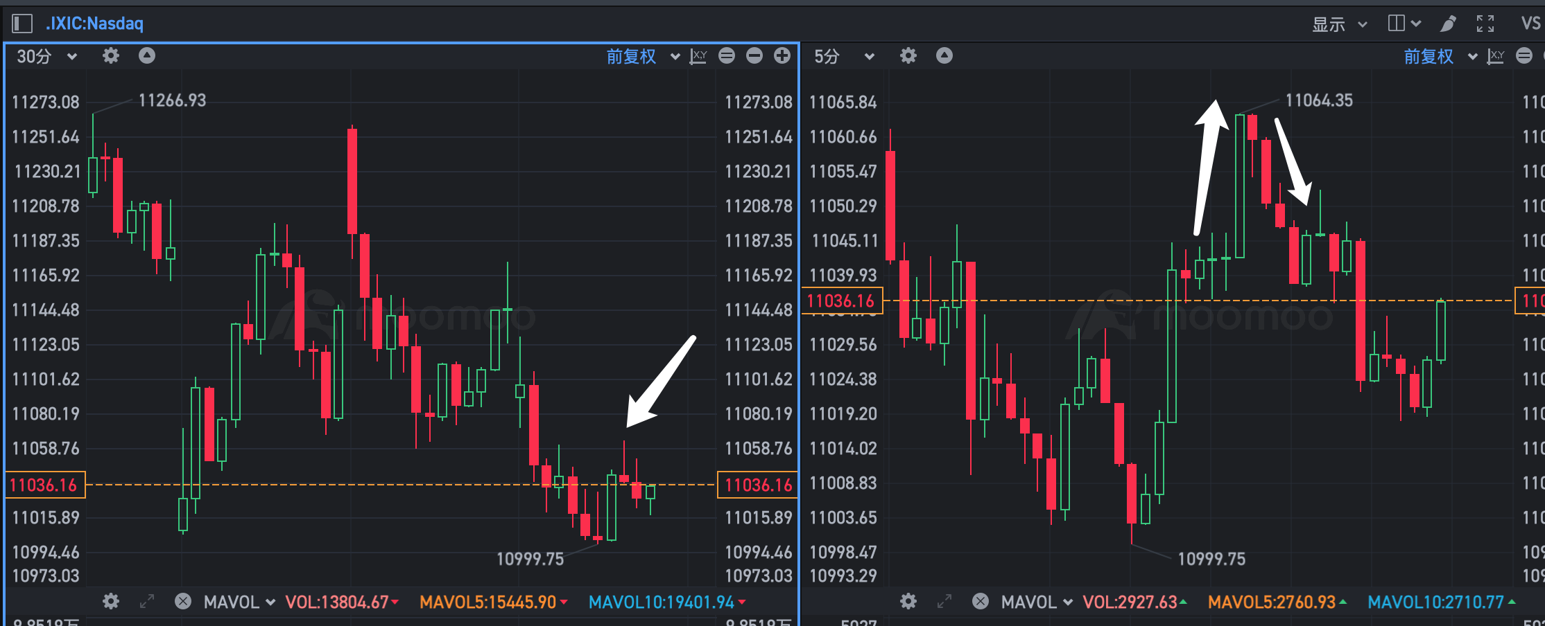 内部结构例子1: 2022年11月21日 纳斯达克指数。30分钟形成的单k线反转。