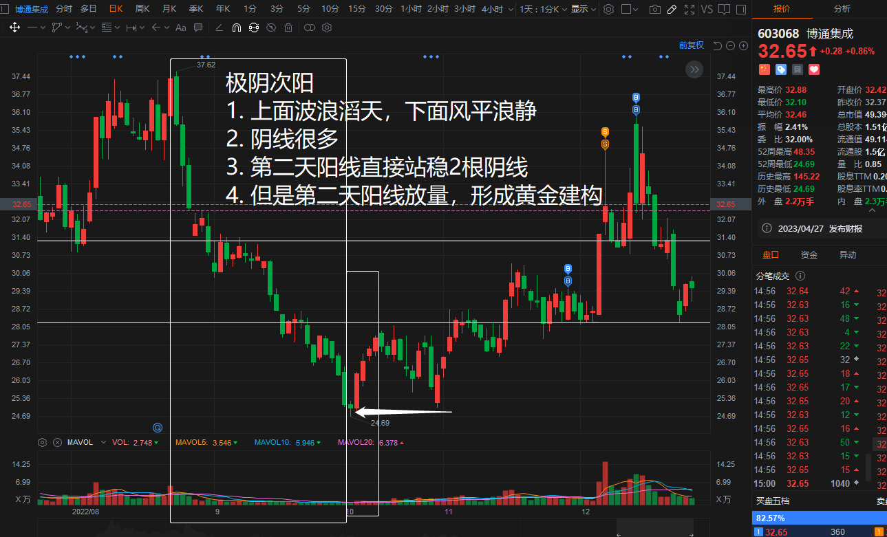 (2)阴线回踩有底(第1根,极阴),并且有效稳住