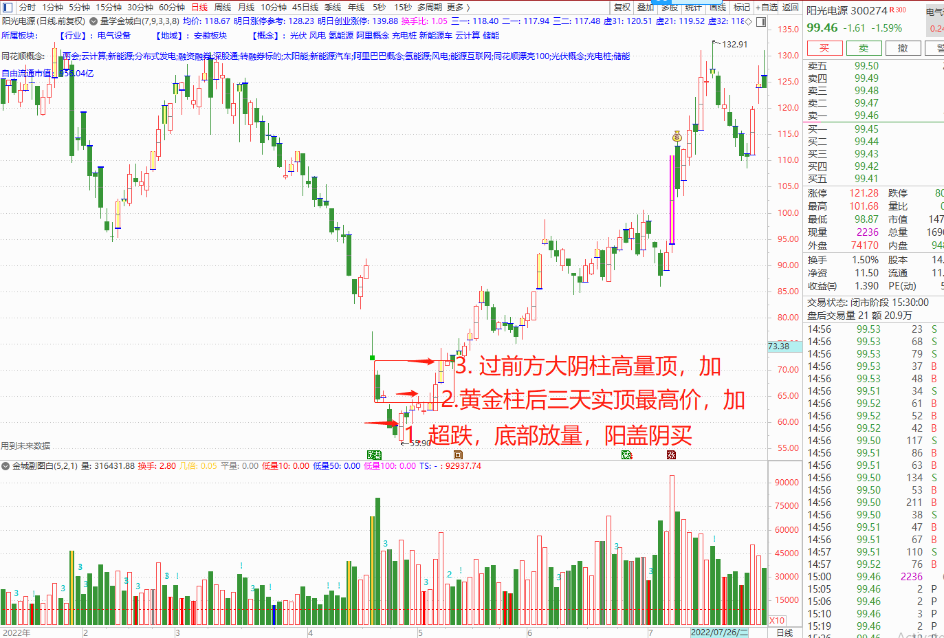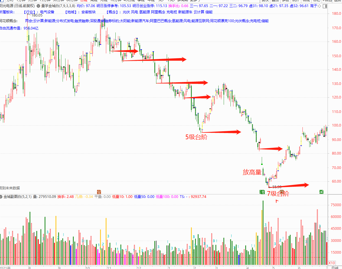 (2)7级台阶下跌,超跌,可能伴随放量。关注放量大阴线!关注大阴实顶,并且跳空补空