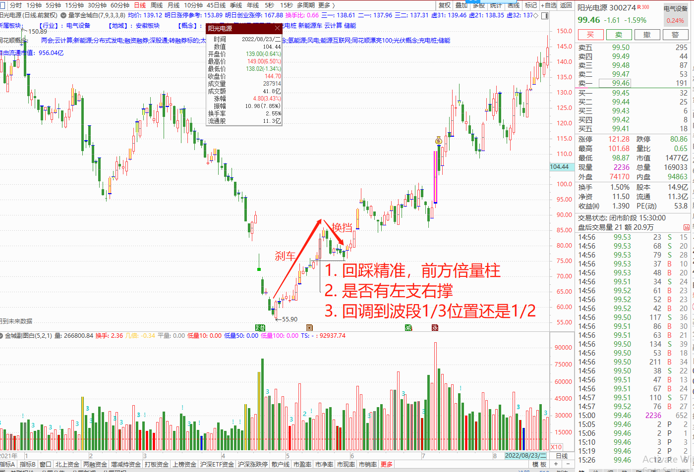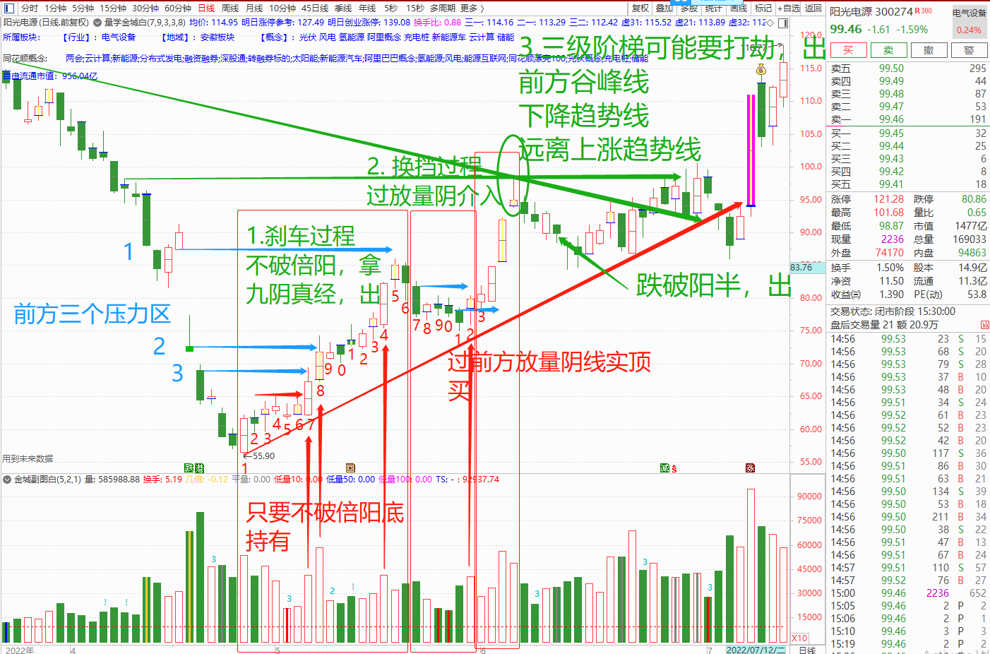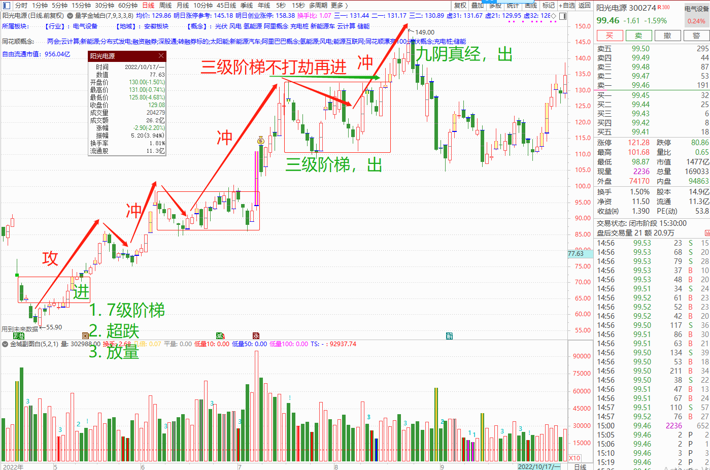 4. 再次上攻后,每天止损点上抬。以走完攻守冲防三部曲为撤退目标。