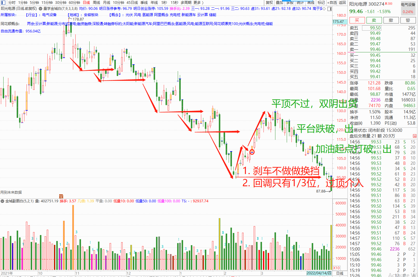 3. 刹车后的换挡是否成功。刹车后的第一段下跌。