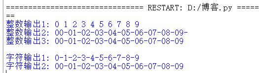 x = list(range(10)) print('整数输出1: ', end = '') for i in x: print(i, end=' ') print('\n整数输出2: ', end = '') for i in x: print(f'{i:02d}', end = '-') print('\n整数输出3: ', end = '') for i in x[:-1]: print(f'{i:02d}', end = '-') print(f'{x[-1]:02d}') print('\n字符输出1: ', end = '') y1 = [str(i) for i in range(10)] print('-'.join(y1)) print('字符输出2: ', end = '') y2 = [str(i).zfill(2) for i in range(10)] print('-'.join(y2))