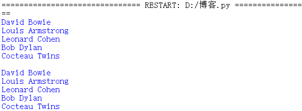 name_list = ['david bowie', 'louis armstrong', 'leonard cohen', 'bob dylan','cocteau twins'] for name in name_list: print(name.title()) print() name_list_captilize = [name.title() for name in name_list] print('\n'.join(name_list_captilize))