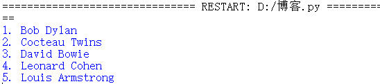 name_list = ['david bowie', 'louis armstrong', 'leonard cohen', 'bob dylan', 'cocteau twins'] name_list_captilize=[name.title() for name in name_list] list3=sorted(name_list_captilize) for id,name in enumerate(list3): print('{}.'.format(id+1),name)