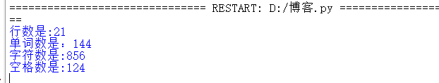 text='''The Zen of Python, by Tim Peters Beautiful is better than ugly. Explicit is better than implicit. Simple is better than complex. Complex is better than complicated. Flat is better than nested. Sparse is better than dense. Readability counts. Special cases aren't special enough to break the rules. Although practicality beats purity. Errors should never pass silently. Unless explicitly silenced. In the face of ambiguity, refuse the temptation to guess. There should be one-- and preferably only one --obvious way to do it. Although that way may not be obvious at first unless you're Dutch. Now is better than never. Although never is often better than *right* now. If the implementation is hard to explain, it's a bad idea. If the implementation is easy to explain, it may be a good idea. Namespaces are one honking great idea -- let's do more of those!''' linenum=0 letternum=0 strinum=0 spacenum=0 linenum=text.count('\n')+1 print(f'行数是:{linenum}') for i in text: if i==' ': spacenum+=1 print(f'单词数是:{len(text.split())}') print(f'字符数是:{len(text)}') print(f'空格数是:{spacenum}')