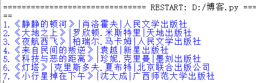 book_list = [['静静的顿河','肖洛霍夫','金人', '人民文学出版社'], ['大地之上','罗欣顿.米斯特里','张亦琦', '天地出版社'], ['夜航西飞', '柏瑞尔.马卡姆', '陶立夏', '人民文学出版社'], ['来自民间的叛逆', '袁越', '','新星出版社'], ['科技与恶的距离', '珍妮.克里曼', ' 詹蕎語', '墨刻出版社'], ['灯塔','克里斯多夫.夏布特','吕俊君','北京联合出版公司'], ['小行星掉在下午','沈大成', '', '广西师范大学出版社']] i=0 while i<len(book_list): if(len(book_list[i])==4): print(str(i+1)+'.《'+book_list[i][0]+'》'+'|'+book_list[i][1]+'|'+book_list[i][3]) else: print(str(i+1)+'.《'+book_list[i][0]+'》'+'|'+book_list[i][1]+'|'+book_list[i][2]) i+=1