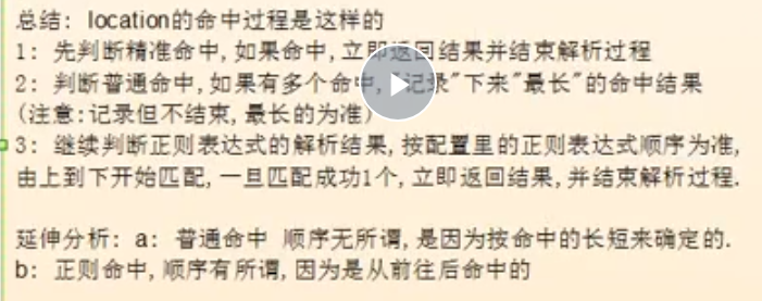 在nginx的location和配置中location的顺序没有太大关系。正location表达式的类型有关。相同类型的表达式,字符串长的会优先匹配。