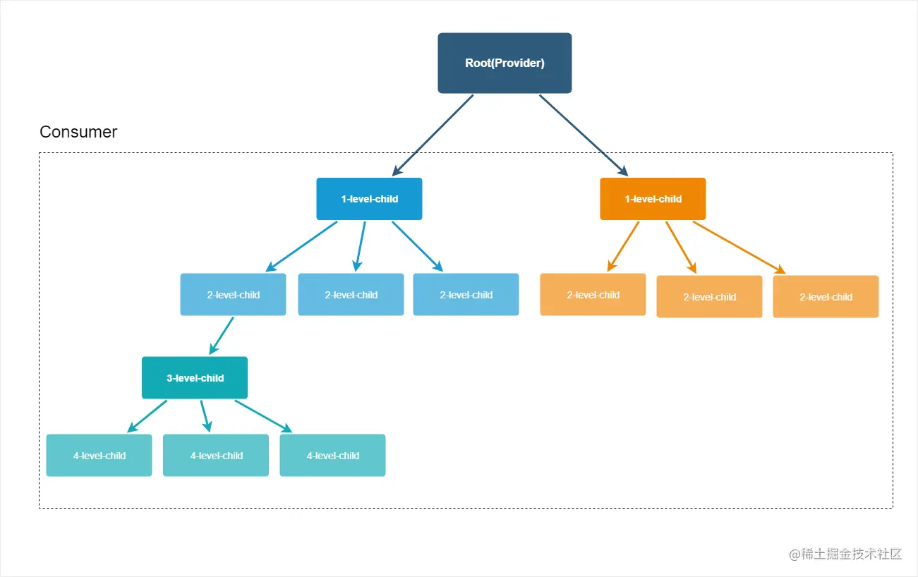 Consumer表示接受数据的组件,它接受一个函数做为子元素。这个函数会接收context传递的值,返回一个react的组件。Consumer组件必须包含在Provider里面。