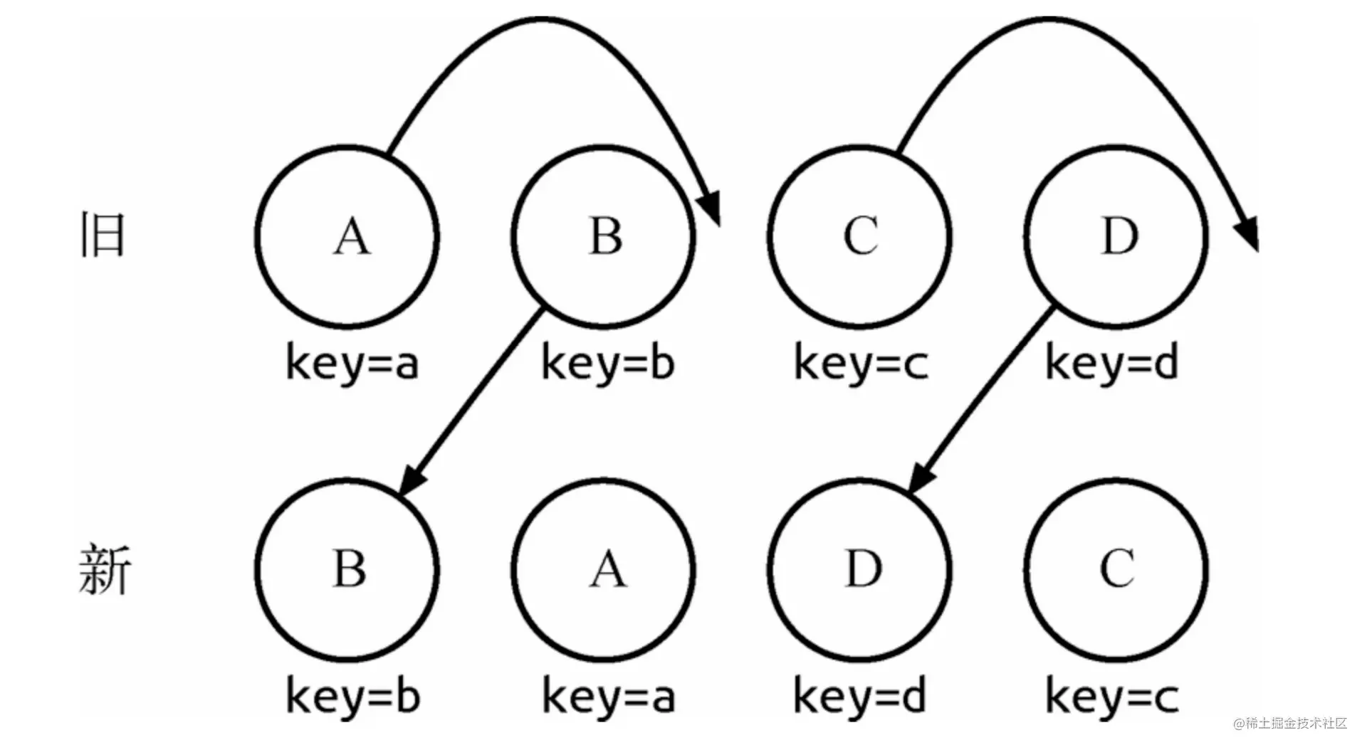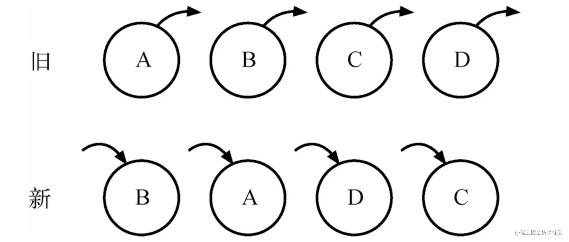通过key可以准确地发现新旧集合中的节点都是相同的节点,因此无需进行节点删除和创建,只需要将旧集合中节点的位置进行移动,更新为新集合中节点的位置,此时React 给出的diff结果为:B、D不做任何操作,A、C进行移动操作即可。