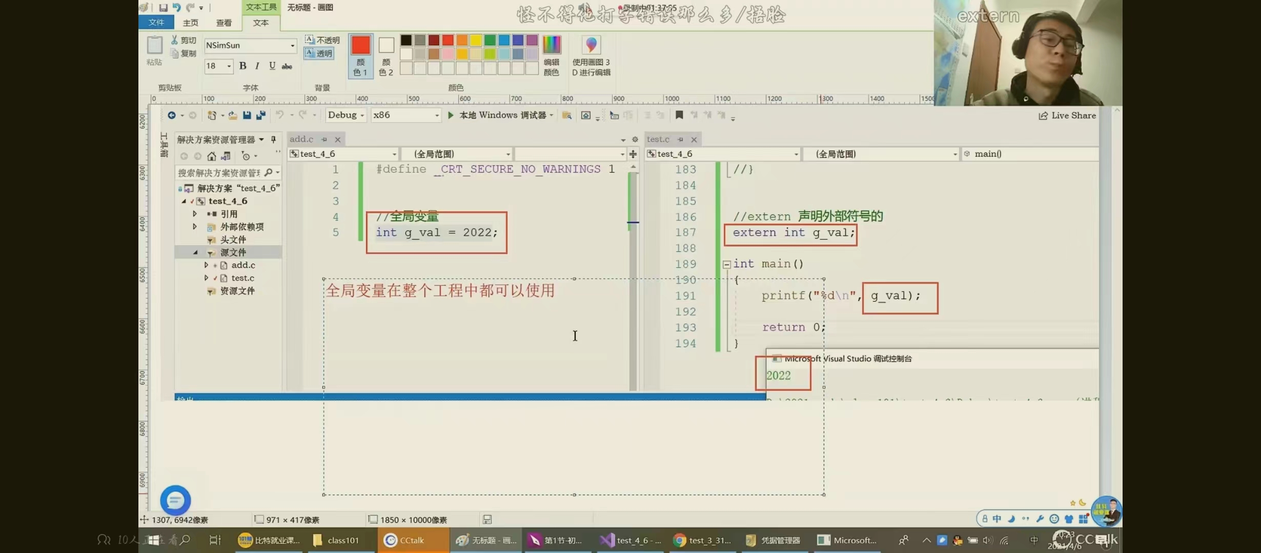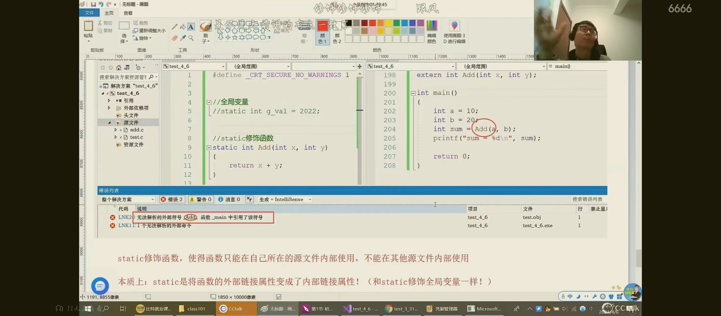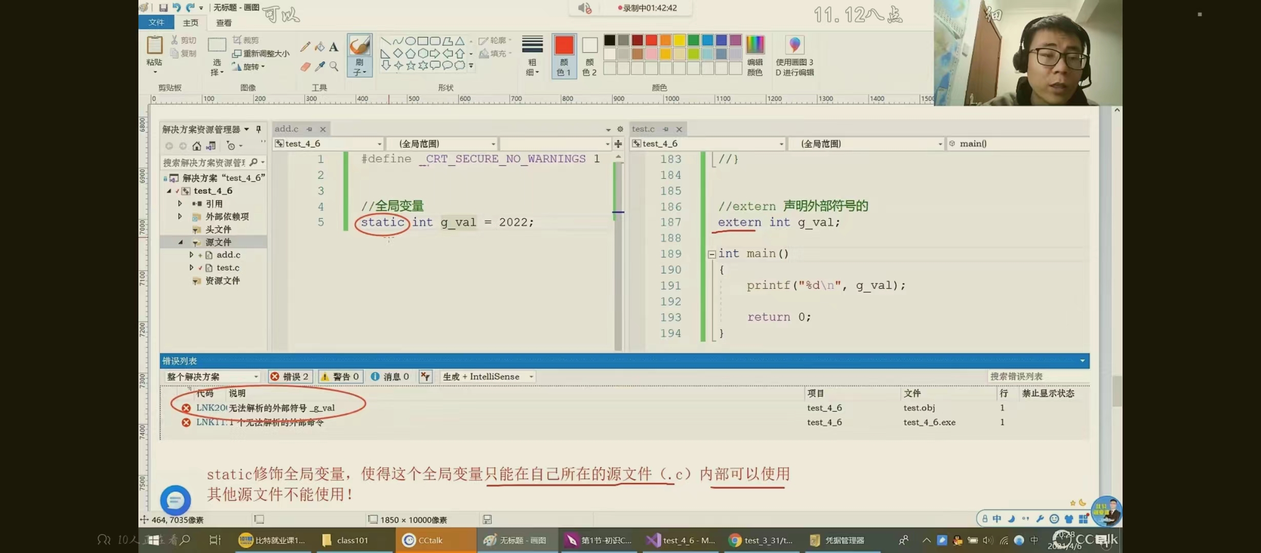 2.static修饰全局变量--使得这个全局变量只能在自己所在的源文件(.cpp)内部使用,其他文件不能使用。