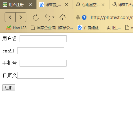 <html> <head> <title>用户注册</title> <meta charset="utf-8"> </head> <body> <form action="regCheck.php" method="post"> 用户名 <input type="text" name="username" id="username" value="" /><br /><br /> email <input type="text" name="email" id="email" value="" /><br /><br /> 手机号 <input type="text" name="mobile" id="mobile" value="" /><br /><br /> 自定义<input type="text" name="check" id="check" value="" /><br/><br/> <input type="submit" value="注册"/> </form> </body> </html>