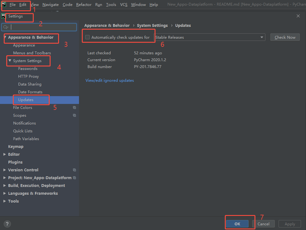 pycharm 进行如下6步,可关闭自动更新。