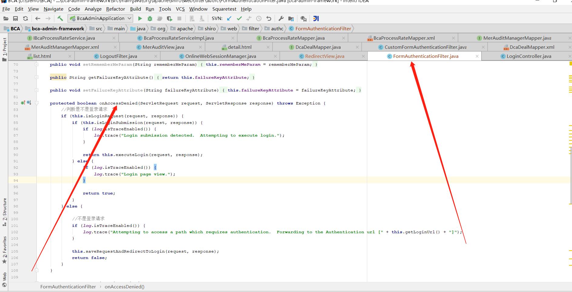 添加一个过滤器去执行该方法,当会话过期这个时候就调用到onAccessDenied方法。记住这里有个点是为什么我不去使用SecurityUtils.getSubject().logout()方法。因为当session过期的时候这个时候我们在这个方法里去调用到他的logout方法这个时候调用是无效的。不会去执行他对应的方法所以需要我们重定向到logout的具体请求上去