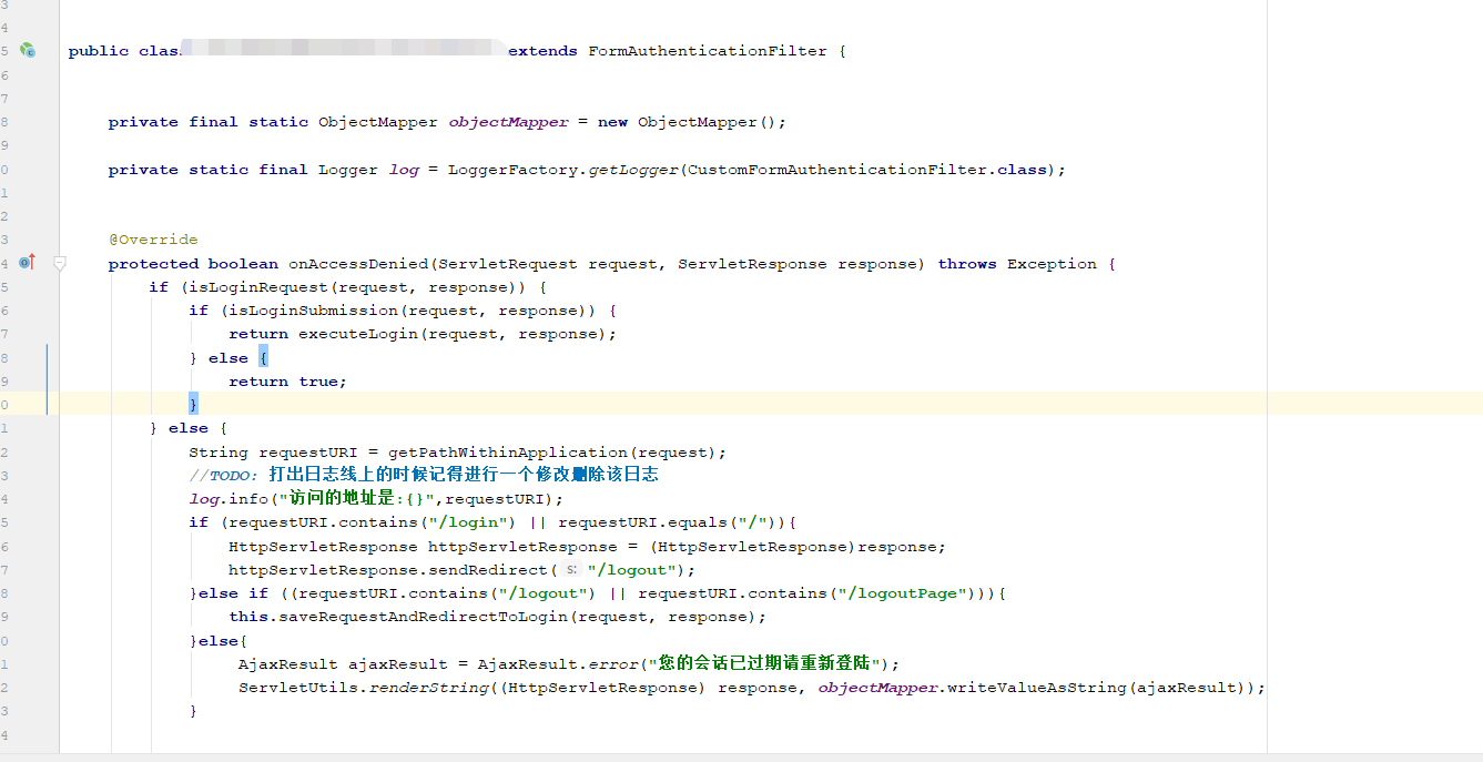 当shiro的session过期这个时候就会走到onAccessDenied方法里面这个时候我就想到了需要对该方法做出一个处理所以就重写了该方法。