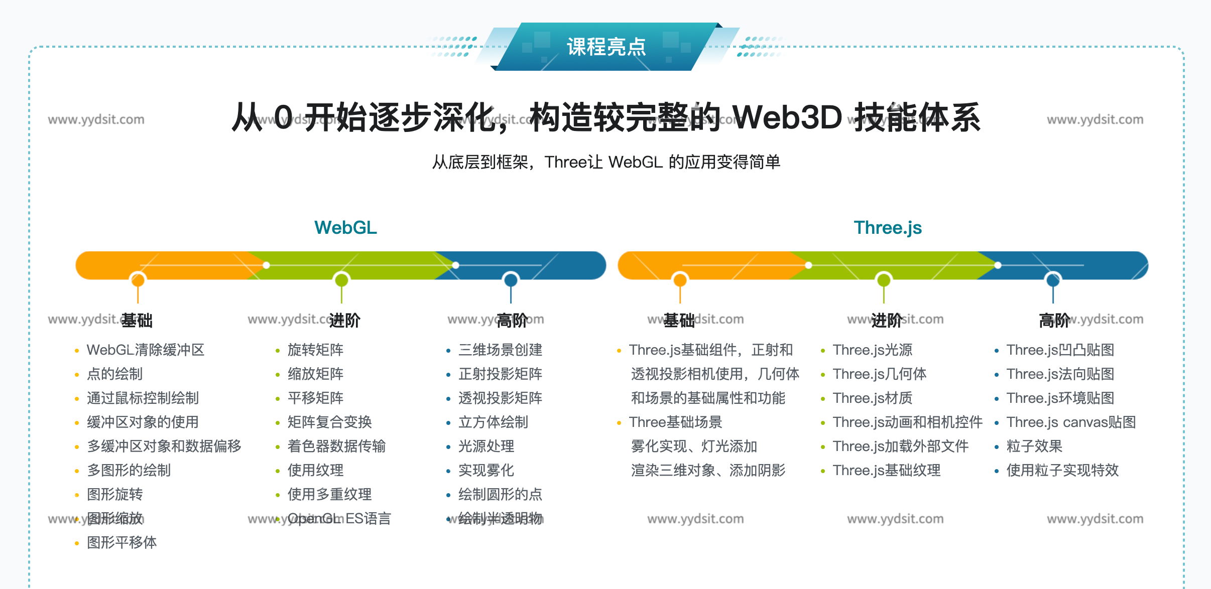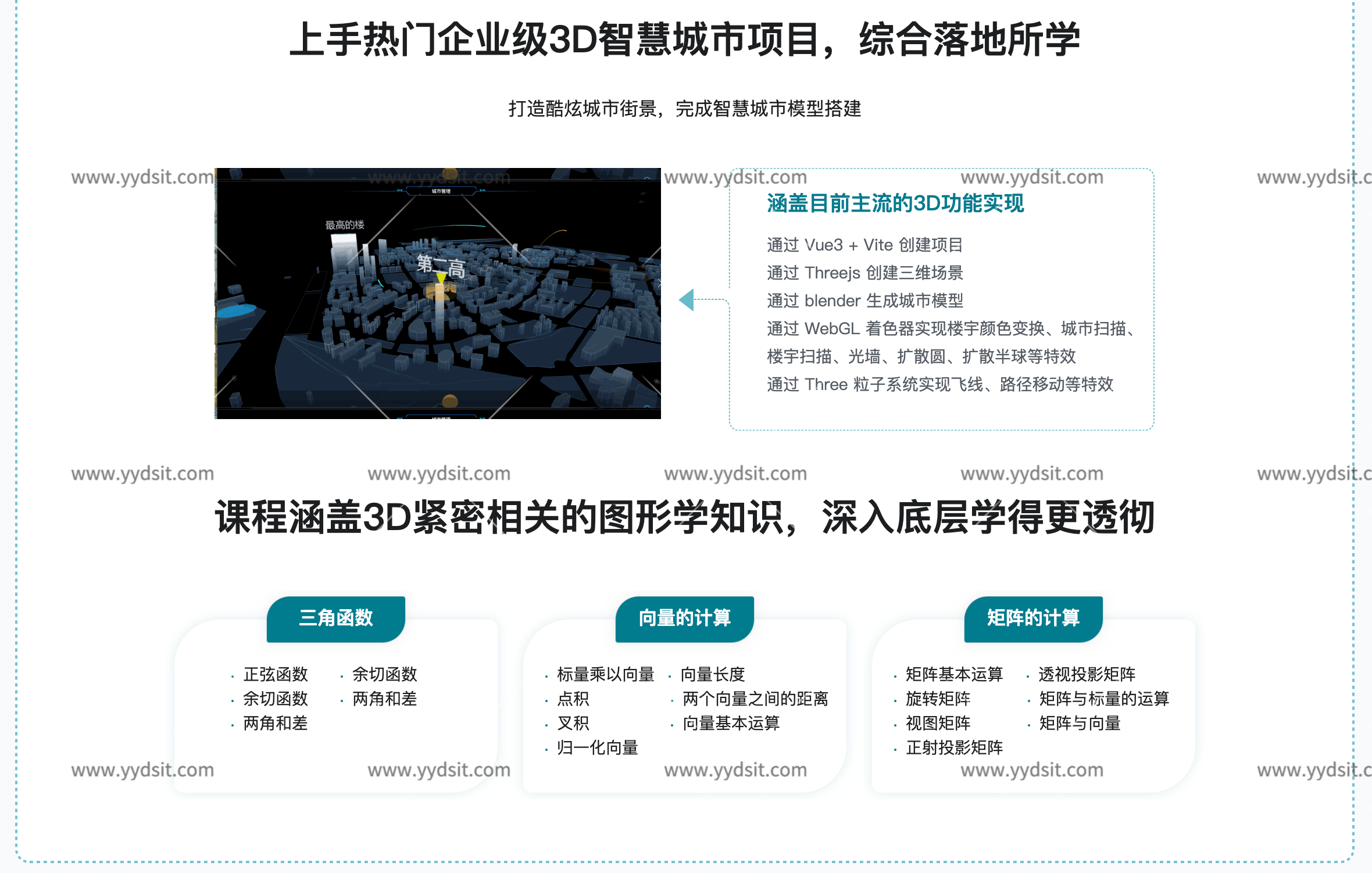 随着元宇宙、数字孪生的火热,前端3D可视化需求越来越广泛,懂 WebGL 技术的前端人才也成为行业香饽饽,薪资诱人颇有竞争力。本课程系统组织了WebGL 和 Three.js 知识内容,并结合图形学相关的数学知识,带你从0基础入门,体系化学习它们的基本、进阶、高级用法。最终通过一款高质量的 3D 可视化项目-智慧城市,让你顺利将 WebGL 和 Three.js 技术落地,掌握其实际应用。