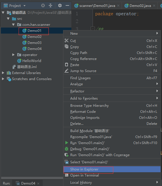 2.右击需要生成java文件,点击Show in Explorer,查找到该文件所在的位置,如下图所示:
