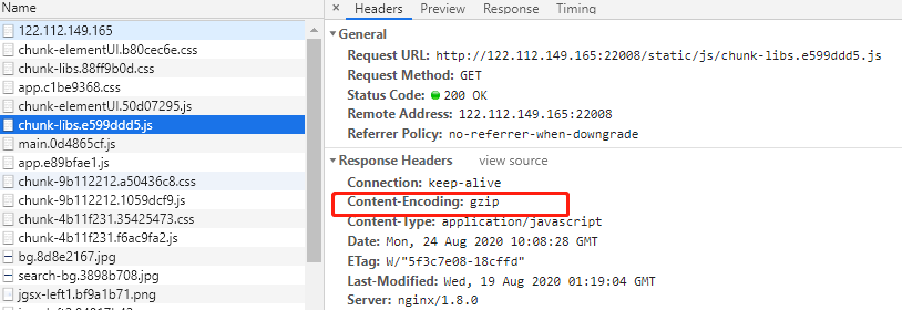 部署到服务器后,访问项目,浏览器控制台看到gzip即成功