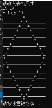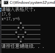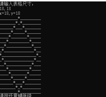 #define _CRT_SECURE_NO_WARNINGS #include<stdio.h> #include<stdlib.h> void check_count(); void combineNum(int x, int y, int z,int num); void printDiamond(int x, int y); int main() { printf("请输入表格尺寸:\n"); int x, y; scanf("%d,%d", &x,&y); printf("x=%d,y=%d\n",x,y); printDiamond(x,y); return 0; } void printDiamond(int x,int y) { int i , j; bool status = true; for (i = 0; i < y; i++) { if (status) { for (j = 0; j < x; j++) { if ((i<(y + 1) / 2 && (j == ((x - 1) / 2 - i % ((y + 1) / 2)) || j == ((x - 1) / 2 + i % ((y + 1) / 2)))) || (i >= (y + 1) / 2 && (j == (x - 1) / 2 - (i - 2 * (i - (y - 1) / 2)) || j == (x - 1) / 2 + (i - 2 * (i - (y - 1) / 2))))) { printf("*"); if (i != 0 && (i - 2 * (i - (y - 1) / 2)) == 0) { status = false; } } else { printf("_"); } } } else { break; } printf("\n"); } }