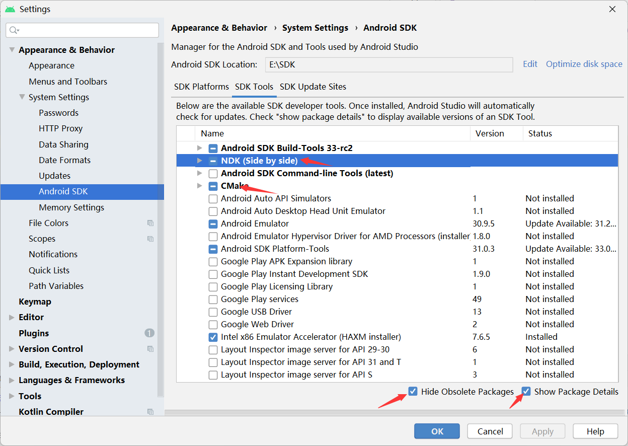 先要安装NDK和Cmake组件,如果安装过了跳到第二部