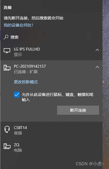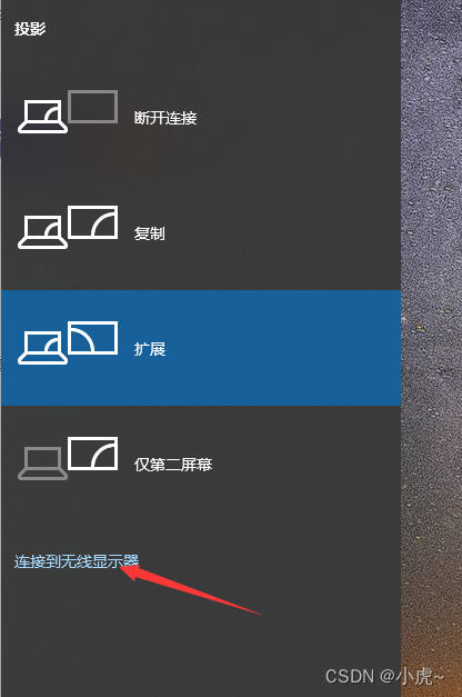 然后在另一台电脑点击Win+P,选择投屏模式,在点击连接到无线显示器