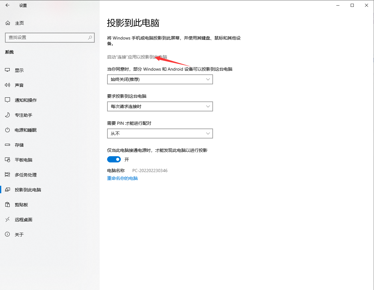 然后点击启动”连接’"应用以投影到此电脑