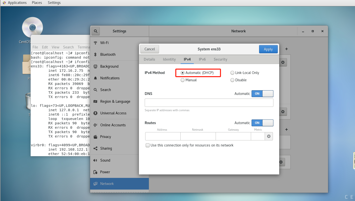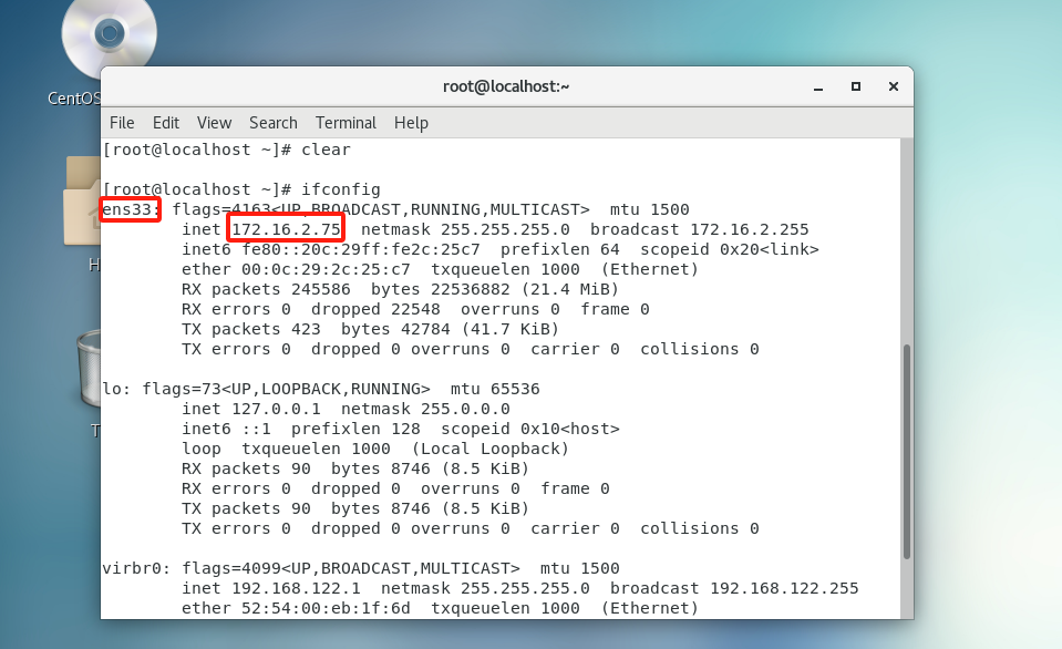 三、在CentOs7上执行命令ifconfig,用获取的ip::172.16.2.75去连接