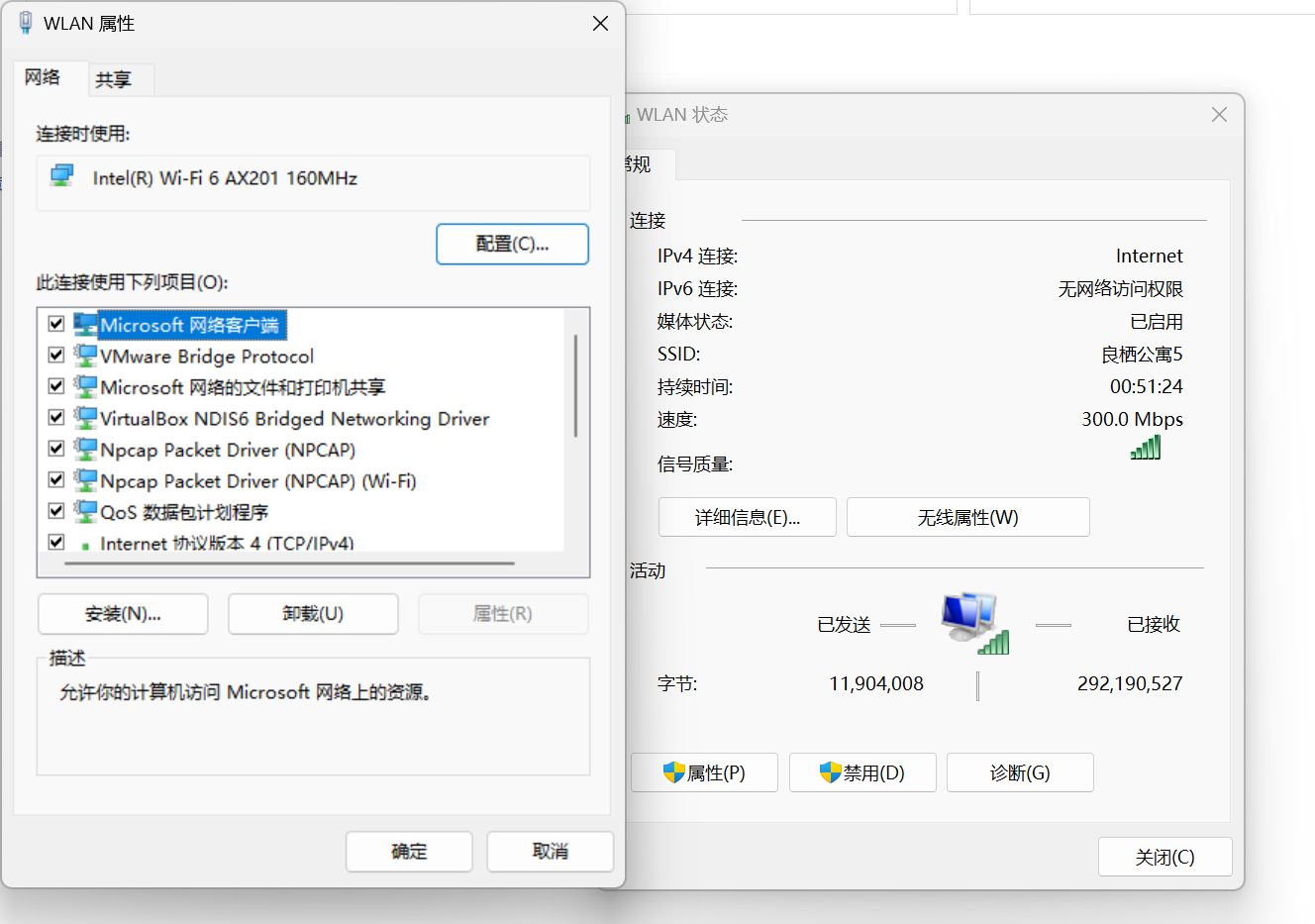 单击连接网络,查看属性,记住连接时使用的网卡
