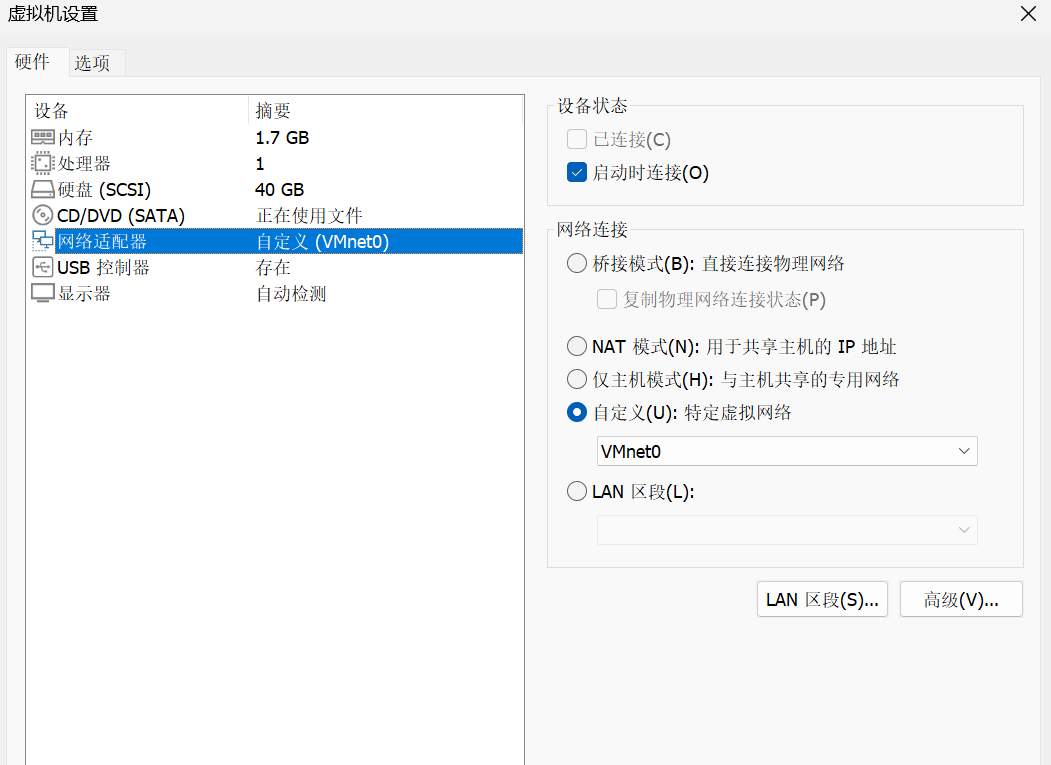 配置虚拟机的网络适配器,选择自定义,并且选择刚刚添加的网络