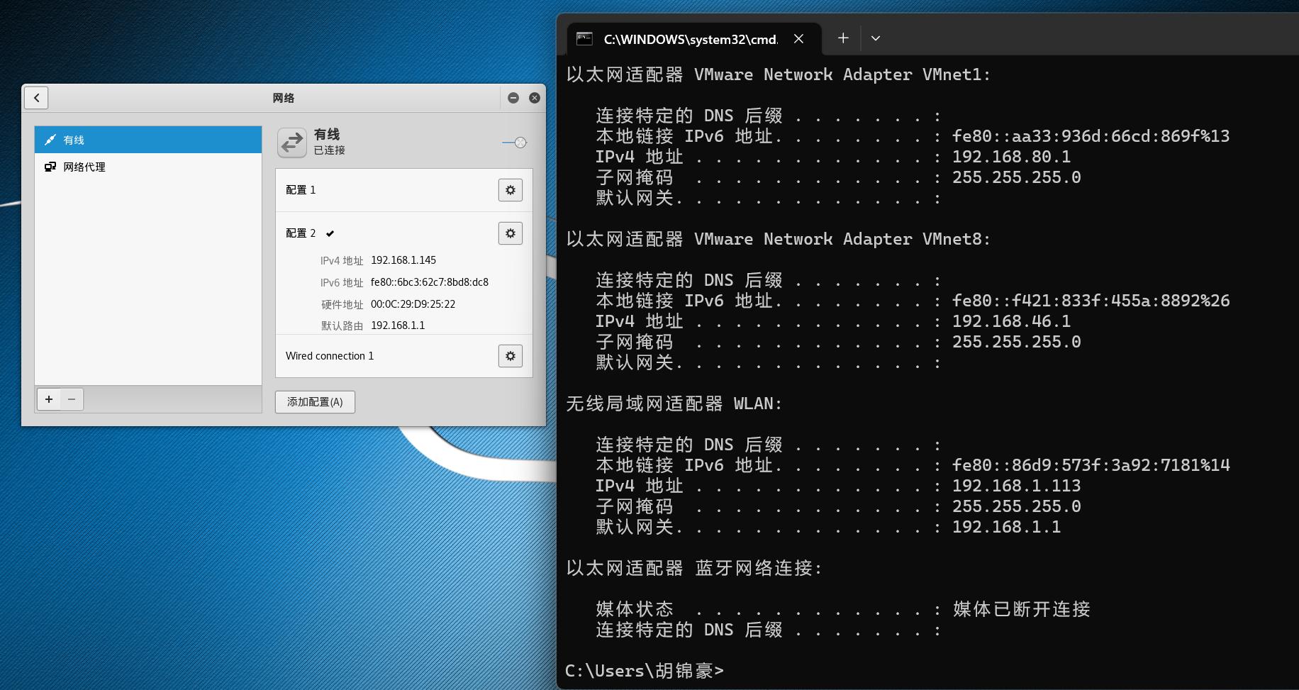 开启虚拟机,在网络配置里,把ip地址改成与物理机相同网段,并且子网掩码,默认网关和dns相同,ping一下物理机,测试是否联通,连通代表桥接成功