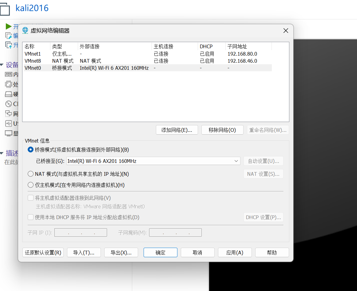 打开虚拟网络编辑器,添加网络,选择桥接模式,桥街至物理机使用的网卡,并且应用
