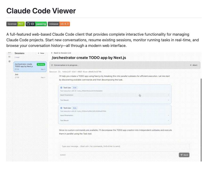 Claude Code Viewer 是一个基于浏览器的客户端工具,专为 Claude Code 项目日志可视化和交互操作设计。它帮助你「查看会话日志/启动新会话/恢复旧会话/浏览项目内容」——一站式管理 Claude Code 对话历史与项目。