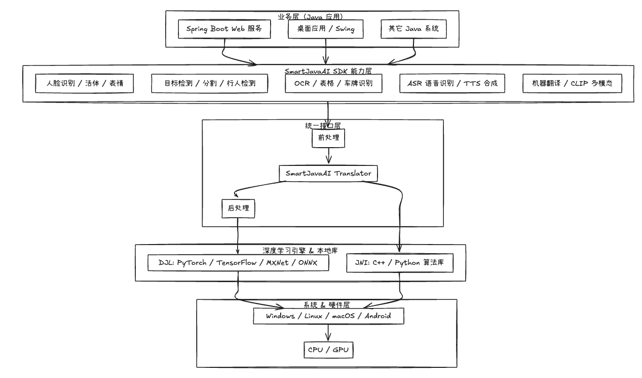 SmartJavaAI 是一个专门为 Java 开发者设计的、功能丰富的离线 AI 算法工具箱。你无需深入研究 PyTorch、TensorFlow 等深度学习框架,也不用自己折腾 C++/Python 算法,只要在 Java 项目里引入一个 Maven 依赖,就能直接调用人脸识别、目标检测、OCR、车牌识别、表格识别、语音识别(ASR)、语音合成(TTS)、机器翻译等能力。底层通过 DJL 封装深度学习模型,并结合 JNI 接入 C++/Python 算法,兼容 PyTorch、TensorFlow、ONNX、Paddle 等主流框架,从而把复杂的模型部署与调用细节全部“藏”在工具箱里。