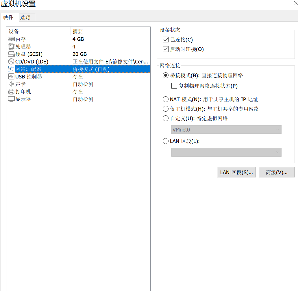 1.将安装好的虚拟机打开,依次点击编辑虚拟机设置,点击网络适配器,改为桥接模式