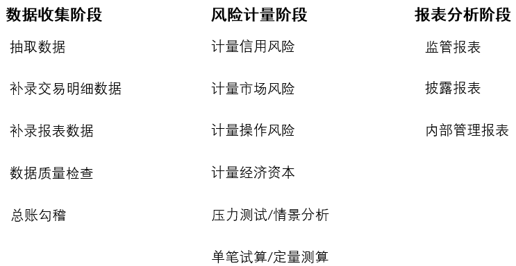 (2)RWA系统:RWA系统是新资本协议合规进程中最主要的项目之一,需实现信用风险RWA、市场风险RWA、操作风险RWA的自动计算,最终获得资本充足率,并生成全行及并表层面监管报表、信息披露报表。计算主要流程如下图:
