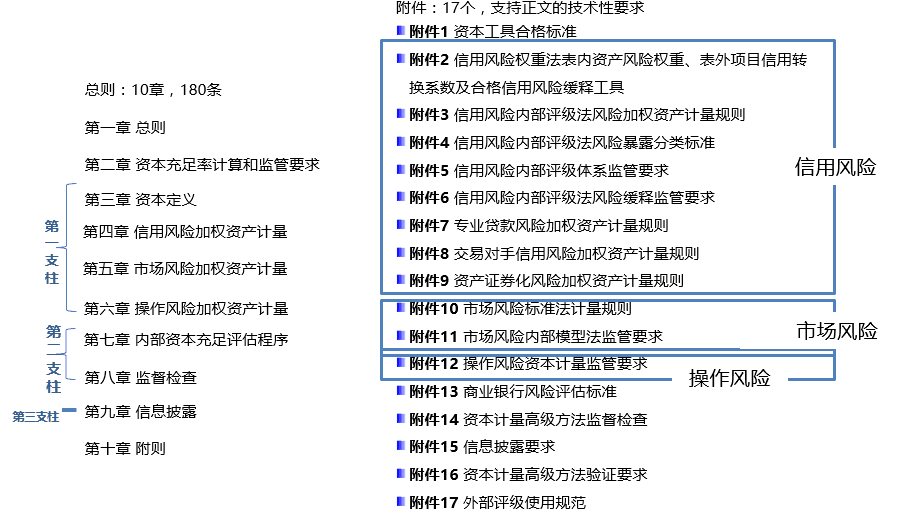 以下是我国银保监发布的《商业银行资本管理办法》的主要目录和附件名称,可以看出要求众多,且对各类风险的计量方式有着明确的方法。有兴趣的同学可以去下载巴塞尔协议III和《商业银行资本管理办法》全文了解具体的规范: