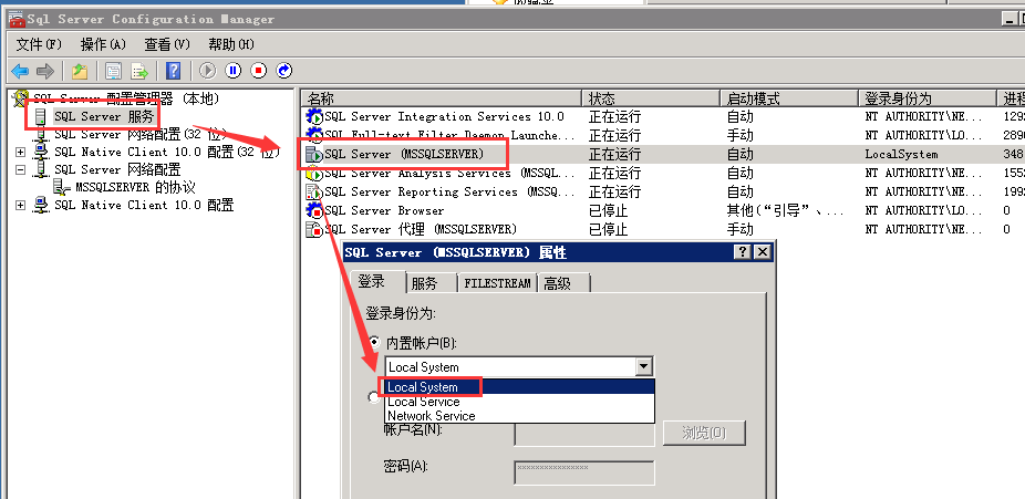 点击【SQL Server服务】-【SQL Server(MSSQLSERVER)】,右键点击【属性】,在登录的内置帐户中选择"Local System"