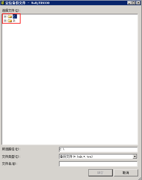 在服务器中操作还原数据库时,无法选择其他盘的数据库文件,只能选择C盘的文件