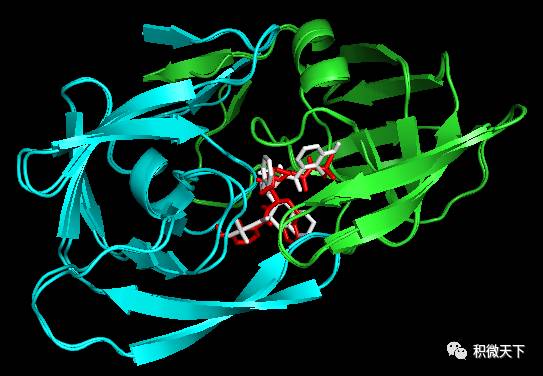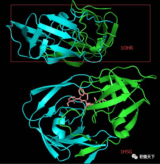 1OHR.pdb文件,在对象面板中依次点选1OHR行-H-Hide everything-S-Show cartoons-C-By chain。从图中可以看到这两个蛋白酶体在空间的方向不同,因此我们需要重新比对这两个结构,运行PyMOL> align 1OHR, 1hsg_prot,可以看到两个结构完全重合了。You may have observed that moving the structure around the window is a bit difficult since the origin of the view has been altered when you loaded 1OHR.pdb. To reset it, try: