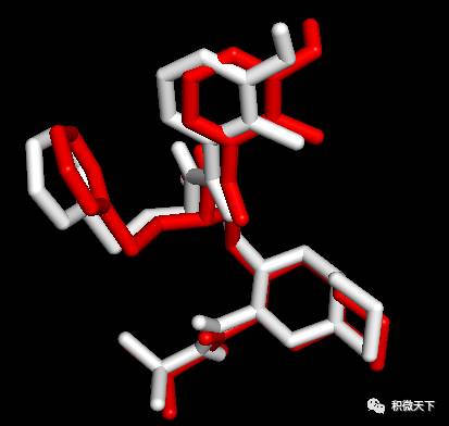 PyMOL> reset,运行之后没有看到变化。Docking结果展示。第一张图表示2个晶体结构align前的展示;第二张图表示2个晶体align后重合在了一起。白色化合物为1OHR PDB晶体结构中配体nelfinavir的构象,视为金标准。红色为本教程的结果(只加极性氢)。